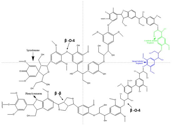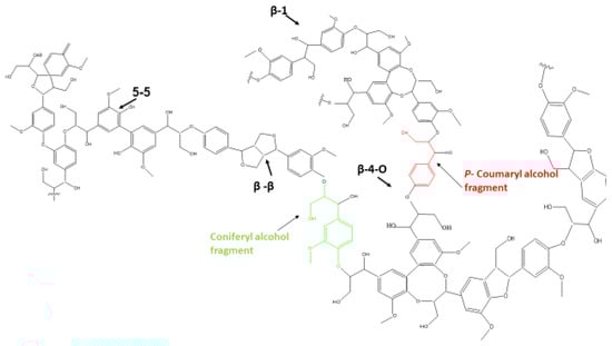 Various methods of lignin separation have been established and each method modified, to some degree, the chemical structure of naturally occurring lignin. According to the first complete lignin structure presented in Figure 11, lignin is known as a highly branched natural polymer, where its physical and chemical properties are affected by its structure and functional groups [88]. Thus, depending on the method of extraction and biomass species, the amount and the position of functional groups can vary on the aromatic rings in different lignin. Studies have indicate that almost all kinds of obtained structural units in lignin degradation are formed by oxidation of coniferyl alcohol, synapyl alcohol, and p-coumaryl alcohol. The bonds and links between phenyl propene units are presented in Figure 12. The structures of hardwood and softwood lignins are presented in Figure 13 and Figure 14, respectively.