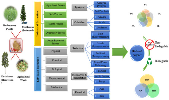 Unlike the commercial lignins, the laboratory lignins are those that have been produced in the laboratory for the purpose of lignin research studies. Milled wood lignin (MWL) is finely milled wood, which is isolated with dioxane from ball-milled wood after extensive extraction of extractive components. In this method of separation, only minor changes occur in the structure of lignin [97]. Acidolysis lignin is extracted from plant tissues by a mild acid hydrolysis. Cellulolytic enzyme lignin (CEL) is obtained from MWL after treatment with a commercially available cellulose-hemicellulose mixture to remove carbohydrate impurities. Enzymatic mild acidolysis lignin (EMAL) is obtained from refined CEL processes, cleaving lignin carbohydrate linkages using a mild acidolysis, while leaving ether bonds within the lignin structure intact [98]. Recent developments in modification of lignin use green solvents as activators for the fabrication of advanced materials such as active platforms for biosensors, biocomposite, and pro-ecological abrasive materials [99]. The use of lignin for the synthesis of new polymeric materials is the most promising alternative to the monomers derived from crude oil for synthesis of polymers. In Figure 15, the overall process diagram of lignin valorization on biopolymer production is presented.