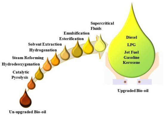 Water, acids, and aldehydes that exist in bio-oil are the main reasons for the poor quality of bio-oil resulting in low heating value, instability, and high corrosiveness of bio-oil [143]. The quality of the bio-oil can be improved by the elimination of water, acid, and unstable components [143]. Accordingly, several physical and chemical technologies have been developed for bio-oil upgrading. In general, the upgrading of the pyrolysis bio-oil can be achieved in three different methods including physical, chemical, and catalytic methods. Supercritical fluids (hot vapour filtration), solvent extraction, and emulsification are three forms of physical upgrading methods. Catalytic upgrading pathways include zeolite cracking, hydrodeoxygenation (HDO), and steam reforming, whereas the chemical upgrading mainly involves the esterification method. Figure 17 illustrates techniques for bio-oil upgradation [144].