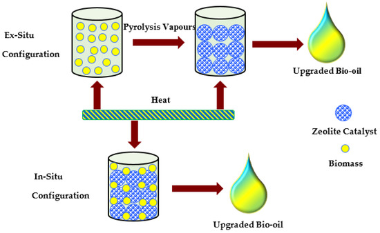 - Huo, X.; Xiao, J.; Song, M.; Zhu, L. Comparison between in-situ and ex-situ catalytic pyrolysis of sawdust for gas production. J. Anal. Appl. Pyrolysis 2018, 135, 189–198. [Google Scholar] [CrossRef]