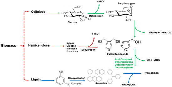 Understanding the reaction mechanisms of the biomass pyrolysis process would enable the process development and reactor design to move from initial research towards the commercial stage. Biomass has a complicated compositional structure, which makes the mechanistic study of the pyrolysis process very challenging. Hence the pyrolysis behaviour is mostly studied based on three main components of biomass, i.e., cellulose, hemicellulose, and lignin [66]. Recently, developed analytical technologies, such as Py-GC–MS [67,68] have been employed for pyrolysis research. However, this method was not capable of providing detailed information on pyrolysis mechanisms. During the pyrolysis process, numerous reactions take place, i.e., dehydration, depolymerization, decarboxylation, and isomerization. The primary reactions include char formation, depolymerization, and fragmentation [69]. Char formation occurs by condensation of the benzene ring during the pyrolysis process, whereas the depolymerization reaction occurs by cracking bonds between the monomers [70]. Figure 6 presents the overall pathways in the mechanism of pyrolysis.