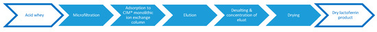 The isolation of LF from whey at the industrial scale is challenging because of its minor proportion in this medium. Various technological approaches are used nowadays for the isolation of individual proteins from milk and by-products of milk processing including whey: (I) paramagnetic particles bound to heparin ligands [11], (II) Cationic surfactants [12], (III) different chromatographic techniques, such as cation exchange or affinity chromatography [13,14,15,16], and (IV) other techniques, such as hydrophobic ionic liquids extractions [17]. Chromatographic techniques, mainly ion-exchange chromatography, represent an efficient and robust approach for LF isolation. Most commonly, strong cationic exchangers are used, in the form of particle resins, membranes, or CIM® (CIM—Convective Interaction Media, trademark of the BIA Separations company) monolithic columns [18,19,20,21]. The separation of whey proteins is carried out in these cases on the basis of differences in isoelectric points (IEP) which are in the pH range from 4.5 to 9.5. The chromatography with monolithic CIM® columns provides some advantages in comparison with other types of columns, such as: (I) high resolution, which does not depend on the flow rate, (II) a simple transition from small to larger chromatographic units without affecting the resolution, and (III) low pressure drop allowing the column to operate at high flow rates, resulting in a reduced separation time [22]. While monolithic ion-exchange chromatography has been increasingly used in the pharmaceutical industry, it has not been used in the industrial production of food and food supplements so far.