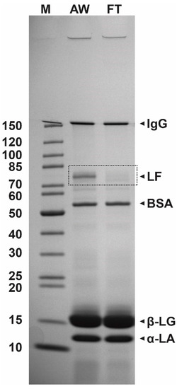 A typical result of SDS-PAGE analysis of acid whey and the flow-through fraction is presented in Figure 2. The predominant whey proteins β-lactoglobulin (β-LG), α-lactalbumin (α-LA), bovine serum albumin (BSA), and IgG representing about 50–55%, 20–25%, 5–10%, and 10–15% of the whey protein fraction, respectively, as well as LF (LF, 80 kDa, 1–2%) were detected in the acid whey samples. The comparison of the protein composition of incoming whey and flow-through whey (Figure 2) clearly demonstrated that most of LF effectively bound to the column as the band representing LF was very weak in the sample of flow-through whey.