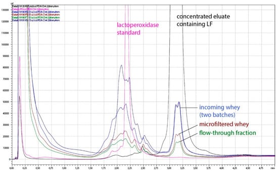Whey proteins have a wide range of isoelectric points (pI), and this characteristic enables their separation by ion-exchange chromatography. Three major components among whey proteins, β-lactoglobulin (β-LG), α-lactalbumin (α-LA), and bovine serum albumin (BSA) are acidic proteins, with isoelectric points 5.4, 4.4, and 5.1, respectively [6]. Bovine milk lactoperoxidase (LPO), however, is like LF a positively charged protein, both having isoelectric pH above 8 (9.6 and 8.0–8.5, respectively) [8,26,27], which makes their separation more difficult. In a process developed in this study, LF and lactoperoxidase, and partially Ig G (isoelectric pH 6, 4–9) were selectively bound on the monolith column. In the elution step, however, LF was selectively eluted from the column. As can be seen on the HPLC chromatogram (Figure 3), the concentrated eluate contained a high proportion of LF, in comparison with incoming whey, microfiltered whey and flow-through fractions where other proteins predominated.