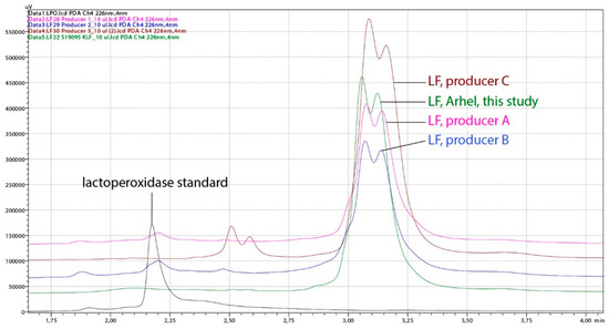 The concentration and purity of obtained LF was compared with some products containing LF available on the market. The purity of nine batches of lactoferrin produced in this study, assessed on the basis of LF chromatographic peak area (HPLC) proportion (%) in relation of all proteins, reached the values 91.0–95.8%, while the purity of three products purchased on the market was below 88% (Table 2, Figure 5).