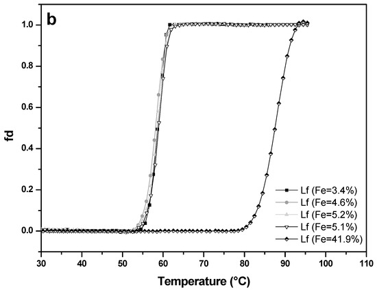 Thermal stability of four apo-LF samples (A-values 3.4%, 4.6%, 5.1%, 5.2%) and one LF with higher iron saturation (A-value 41.9%) was studied at pH 4.0 (Figure 7a) and pH 7.0 (Figure 7b). At pH 7.0, apo-LFs showed thermal stability up to about 53 °C, with denaturation temperature (Tm) of 58.6 °C (±1.2 °C), while LF with higher iron content remained unchanged up to approximately 80 °C, with Tm 87.8 °C (±0.7 °C). Such results were expected since it is already well-known from the previous studies that apo-LF has more open conformation and is more prone to thermal denaturation than holo-LF, which has more closed conformation [33,34,35,36]. There is, however, limited data about the thermal stability of LF, in conjunction with iron saturation level, at acidic pH. At pH 4.0 all apo-LF samples from this study were thermally stable to approximately 40 °C with the denaturation temperature (Tm) about 44.7 °C (±0.8 °C), while LF with higher iron content (A-value = 41.9%) showed thermal stability up to approximately 70 °C, with Tm of 80.6 °C (± 0.3 °C). Comparison with the results obtained at pH 7 showed that all LF samples tested were more prone to denaturation in acidic conditions. Similar was reported by Abe et al. [37], whose observations based on HPLC pattern of heat-treated apo-LF, and Kawakami et al. [38] who observed the reduction (15–30%) of the iron-binding capacity of native LF after heat-treatment (90 °C/10 min) in acidic conditions. The results on the thermal stability of LF in acidic conditions, depending on the iron content, will be useful when developing of products (dairy, non-dairy food, food supplements) containing LF, with the aim of preserving the bioactivity of this heat-sensitive protein.