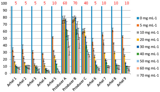 The growth inhibition of E. coli O157: H7 tox- by nine samples of LF produced in this study (Arhel) and three LF products purchased on the market. The concentrations used in the assay apply to the concentration of pure lactoferrin (commercial products may contain some other ingredients). % of growth (measured as OD600) compared to the sample without added LF (100%) is shown. MIC breakpoint was the concentration of LF that resulted in >50% inhibition). MIC values are indicated above the bars (in red).
