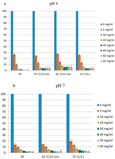 In order to examine the effect of heat treatment on the biological activity of apo-LF produced in this study, two aliquots of LF solution (200 mg mL−1) were prepared, one was adjusted to pH 4.0 and another one to pH 7.0. Four aliquots of each solution were subjected to different heat treatments: (I) 15 min at 55 °C, (II) 15 min at 60 °C or (III) 3 s at 72 °C. After heat-treatment, the remaining antibacterial activity was assessed by the microdilution method. In general, heat treatment did not reduce antimicrobial activity against E. coli indicator strain, regardless of pH (Figure 9a,b). These results are in accordance with the previous study of Sánchez et al. [34], which showed that the pasteurization (72–74 °C, 15 s) had no significant effect on the structure of LF and on its immunoreactivity. Similarly, Conesa et al. [44] have observed that the heat treatment at 62 °C for 30 min (low temperature long time—LTLT pasteurization), at 72 °C for 15 s (high temperature short time—HTST pasteurization) and at 72 °C for 10 min did not affect the antibacterial activity of LF (iron saturation 26%) against E. coli O157:H7, but 85 °C for 10 min destroyed antimicrobial activity.