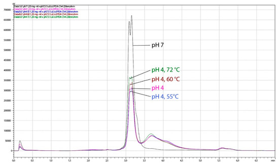 The HPLC analysis of the same LF samples showed a slight degradation of LF observed as the lowering of the dual LF peak and the presence of an additional peak at higher salt concentration. When the pH of LF samples was adjusted to pH 4.0, slight degradation was observed in all heat-treated samples (55 °C/15 min, 60 °C/15 min, 72 °C/3 s), as well in the non-heated control (Figure 10). Heat treatment at pH 7.0 led to similar chromatographic pattern at pasteurization temperature only (Figure 11). The sample treated at 60 °C for 15 min at pH 7 could not be tested by HPLC or for antimicrobial activity since it was completely solidified. Given that spectroscopy carried out in this study showed slightly better thermal stability of apo-LF at pH 7 than at pH 4, these irreversible change might be a result of a combination of different factors such as high concentration of lactoferrin in the sample (200 mg mL−1), longer treatment and particular ionic strength. Partial degradation of some samples demonstrated by HPLC, however, did not result in the reduced antimicrobial activity, indicating that the iron-binding activity was not affected.
