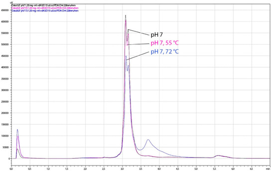 Chromatograms obtained by HPLC analysis of lactoferrin (LF) samples, thermally treated at pH 7. The analysis was performed on the HPLC system weak cation exchange column CIMac™COOH-0.1. Black line, control LF (no thermal treatment); pink line, 15 min at 55 °C; blue line, 3 s at 72 °C.