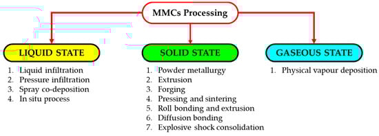 As the awareness of the importance of MMCs grows, many interested parties have taken the initiative to continue developing the proper techniques for MMC fabrication. There are several methods currently being practiced both by industry and researchers. Generally, MMC fabrication can be classified into three categories: (a) liquid-state processing, (b) solid-state processing, and (c) gaseous processing. Figure 1 elaborates these three categories in a well-structured diagram.