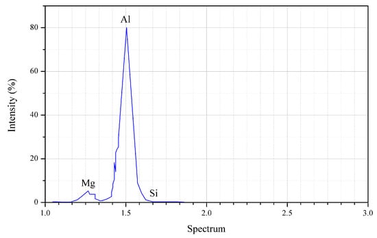 As-cast aluminum 6061 bulk series and alumina (Al2O3) powder sized ~1 μm with 99.9% purity were obtained from commercial vendors. Al2O3 was chosen as the reinforcement material due to it being chemically inert with aluminum, while it can also be used at a higher temperature, compared to unreinforced aluminum [24]. In addition, particles or discontinuously reinforced constituents provide many benefits for composites, including high modulus and strength, improved thermal stability, better wear resistance, and relatively better isotropic properties, compared to fiber reinforced composites [4]. The material investigated in this study was milled from pure as-cast AA6061 bulk. The bulk was inspected and confirmed to comply with the Standard Specification for Aluminium and Aluminium-Alloy Sheet and Plate (ASTM B209). The 6xxx series aluminum consists of Al-Mg-Si, and all of these elements appeared in the test specimen. The composition was balanced with respect to the content of Si, Mg, and Al. By referring to Figure 2, aluminum showed the highest peak of the elements, and the others were Mg (5.84 wt. %), Si (0.17 wt. %), and other elements (<0.01 wt. %) [23]. The composition of 99.9 % purity Al2O3 (Sigma-Aldrich, Saint Louis, MO, USA) with a size of ~1 μm mainly consisted of aluminum (Al) and oxide (O).