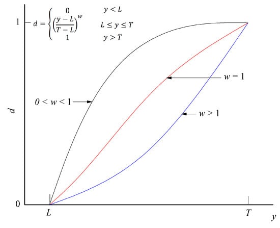 where D is the overall desirability and n is the number of responses in the measure. If any of the reactions or elements fall outside the desirability range, the general function becomes zero. For synchronous optimization, every reaction must have a low and a high value given to every objective. Derringer and Suich proposed different desirability functions d, depending on whether a particular response y is to be minimized, maximized, or assigned a target value [34,38,39]. This study involved determining a single set of process conditions, maximizing the three responses (UTS, ETF, and MH) simultaneously. Figure 4 depicts the desirability function for maximizing response y, where y is the response value, L and T are the lower limit and target of the response, respectively, and w is the weight coefficient, with the weight being maintained at a value of one (1) so as not to be affected by different output variables [40].