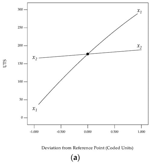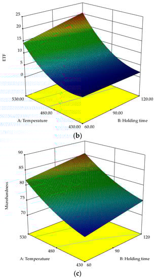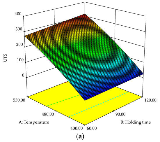 These models were shown to be an adequate representation of the response (UTS, ETF, and MH). By comparing Equations (4)–(6) with Equation (2) in Section 2.4, one can notice that β1 > β2 for all the responses. It could be concluded that the factor A (temperature) had the greatest effect on all responses due to its coefficient being the highest. Throughout the prediction models above, there were factors that interacted with each other, indicating either the synergistic or antagonistic effects of two factors. The positive β12 values obtained for both UTS (+8.86) and ETF (+1.57) showed the synergistic effects experienced, meaning that a combination of the factors A and B (temperature and holding time) produced higher value responses than would be expected just by single factor effects. On the contrary, β11 appeared to have positive and negative coefficients, which indicated that it experienced both synergistic effects for ETF (+4.38) and MH (+1.41), as well as antagonistic effects for UTS (−17.13). The second-order effect of temperature would lower the UTS, while increasing the ETF and MH of the composite.