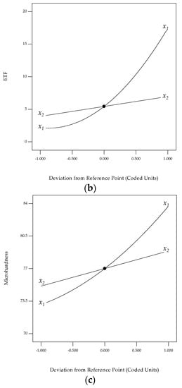 RSM gives the predicted models as far as coded and actual variables are concerned. Coding makes a direct representation between coefficients conceivable, while the actual terms change contingent upon the unit of measure. These terms could be utilized to represent the consequences of this study; however, they cannot be utilized for displaying future reactions. The program prescribed the utilization of the quadratic model structure for every single factor variable. Subsequent to removing the non-critical terms, the last experimental relationship (as far as the coded factors are concerned) for all reactions can be expressed as Equations (4)–(6):