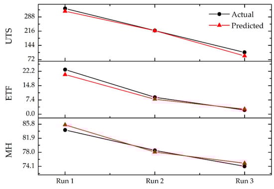 To verify the sufficiency of the generated model, three verification run tests were performed. The reaction conditions inferred before were utilized as the expectation for the actual value. Table 7 records the qualities of the verification runs and the correlation made against the anticipated designed for UTS, ETF, and MH. The test condition for the first run was the ideal recommended condition, while the other two runs were not, however still within the range as previously shown in the table.