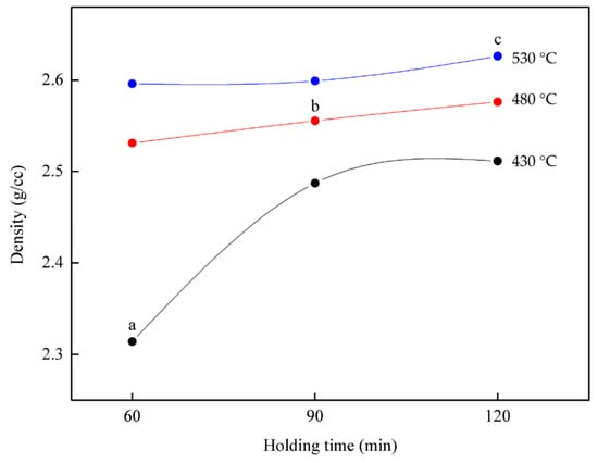 The influence of temperature at various holding times on the density of the composites is shown in Figure 9. As is clear, the density of the composites improved as the holding time and the temperature increased. Deficient temperature and holding time caused the composite to have substantial voids, resulting in a low density. When exposing composites to a higher temperature, the voids became smaller, and the micro-sized Al2O3 was able to occupy the opening and directly work to strengthen the ductile aluminum. This process was facilitated by the increment of the holding time to permit the composite to have better adhesion between the chips. The proper combination of temperature and holding time would allow the composite to achieve a good density.
