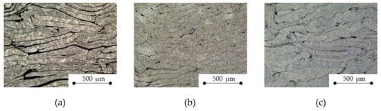 Figure 10 shows the respective microstructures corresponding to Points a, b, and c marked in Figure 9. As can be noticed, an increase in the temperature and holding time caused a decrease in the void size between chips. This resulted in the Al2O3 particles more easily filling the voids and decreased the porosity, thus enhancing the density of the composite. In another study on the material integrity, it was shown that the internal strain was unintentionally altered during the hot press forging process, which may have resulted in a different degree of plastic deformation in the composite grains. Additionally, a high operating temperature and holding time contributed to the increase in the crystalline size. The Al2O3 also acted as a catalyst for the structural size change. Hard ceramic particles introduced into the composite caused the matrix to expand in all directions, creating better bonding in the matrix, thus yield better performance of MMC-AlR [23]. Furthermore, the analysis of the grain structure showed that the grain average diameter reduced as the temperature and holding time increased. The grain growth of the composite was suppressed by the ceramic additive, which improved the material properties.