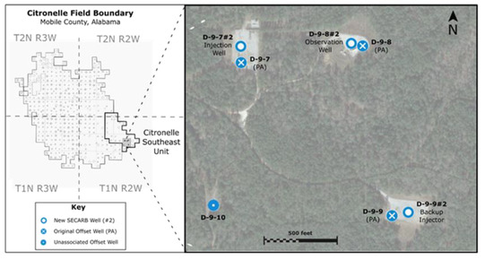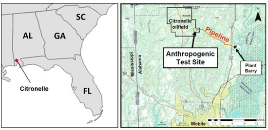 Location map of the Anthropogenic Test Site, the Citronelle oilfield, and Plant Berry.