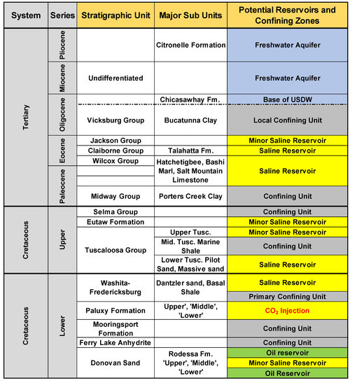 - Pashin, J.C.; McIntyre, M.R.; Grace, R.L.B.; Hills, D.J. Southeastern Regional Carbon Sequestration Partnership (SECARB) Phase III Final Report; Geological Survey of Alabama: Tuscaloosa, AL, USA, 2008. [Google Scholar]
