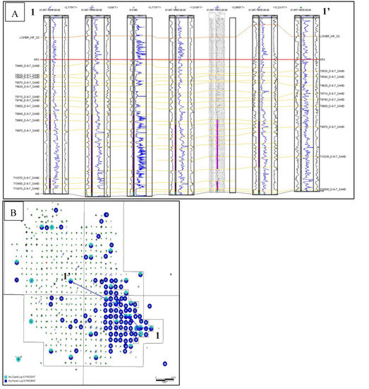 (A) Geological cross section through the Citronelle Field area showing the top of the Paluxy Formation (KPX) and the individual sand intervals of the Paluxy (T9460 through T10470) interpreted within the formation from vintage well logs. The log tracks from left to right are spontaneous potential (SP), induction (ILD), and short normal (SN). The cross section has been flattened to the top of the Paluxy Formation. (B) Map of the Citronelle Field area and the corresponding cross section line. Source: Author Conception. Cross section and map created in Petra ®.
