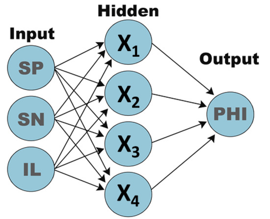 Structure of the Artificial Neural Network with a single input layer containing digitized SP, ILD, and SN values. The inputs are passed into the hidden layer containing four nodes which produce a synthetic porosity (PHI) output.
