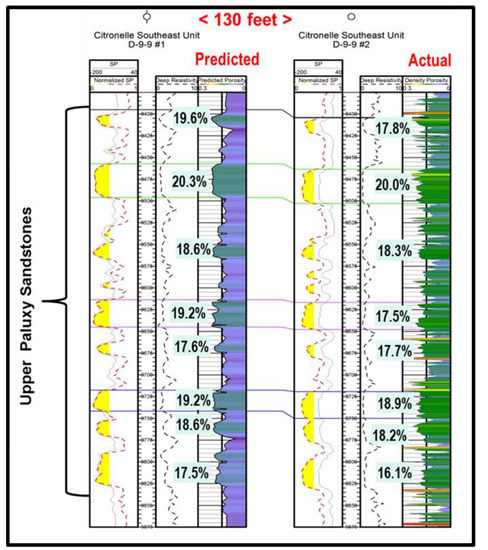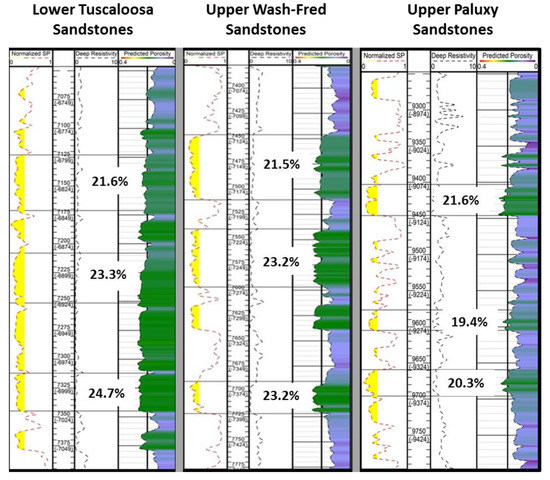 An example of the synthetic porosity curve of well A-34-6 #1 is shown in Figure 9. This well is located approximately 5.5 m (8.9 km) west of the D-9-9 #1 well used to validate the neural network. A mean porosity of ~20.4% was predicted for this well within the upper Paluxy Formation. The neural network also determined multiple high porosity zones within the overlying sand reservoirs of the Washita-Fredericksburg Group and Lower Tuscaloosa Group. Together, these high porosity zones are separated by low porosity intervals interpreted as mudstones.