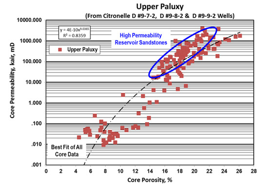 After generating synthetic porosities across the field, core-derived porosity and permeability was determined at each of the newly drilled test wells. An empirical relationship between core-derived porosity and permeability was calculated and used to determine the permeability of the Paluxy Formation using synthetic porosity for each of the 36 legacy well locations.
