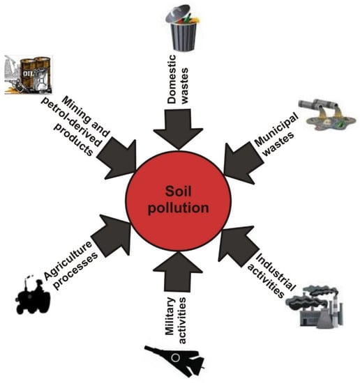 The main anthropogenic sources of soil pollution are represented by domestic and municipal waste, industrial activities, agriculture processes, military activities, mining, and petrol-derived products (Figure 1) [7,8,9,10,11,12,13,14,15,16,17,18], responsible for contamination by toxic metals, pesticides, and organic pollutants.