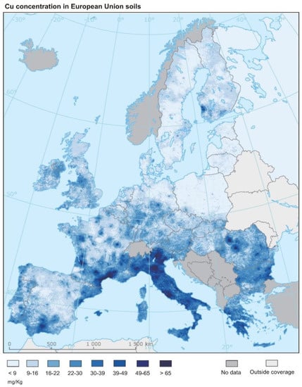 Along the others, potential toxic metals can pose long-term health risks to both ecosystems and human beings [19,20,21,22,23,24]. Some of these elements naturally occur at low concentrations in soils, and they are essential micronutrients for plants, but high amounts also have toxic effects, because metals are generally not degradable [25,26,27,28,29]. A well-known example is represented by Cu, a heavy metal of both geogenic and anthropogenic origin. Kabata-Pendias [30] has indicated that its average concentration in soils is 20–30 mg/kg; higher amounts due to pollution can affect plant growth and physiology [31,32]. However, natural sources and local geology can lead to higher values in many locations. Figure 2 shows the Cu concentration in European Union soil [33].