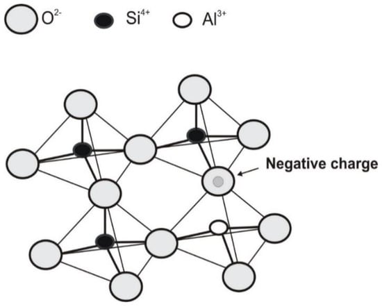 Zeolites are aluminosilicate (tectosilicate) with a three-dimensional network of SiO4−AlO4 tetrahedra, linked together by common oxygen atoms (Figure 3) [51]. Their general formula is Mx+Ly2+[Al(x+2y)Si1−(x+2y)O2n]·mH2O, where M+ and L2+ indicate monovalent and divalent cations, respectively, placed together with water molecules within channels. The zeolite structure determines the high cation exchange capacity and the large surface areas that, together with thermal properties (temperature resistance, thermal stability and conductivity, and heat capacity), make these minerals very useful in many contexts, in addition to soil and water environmental remediation [52,53,54,55,56,57,58].