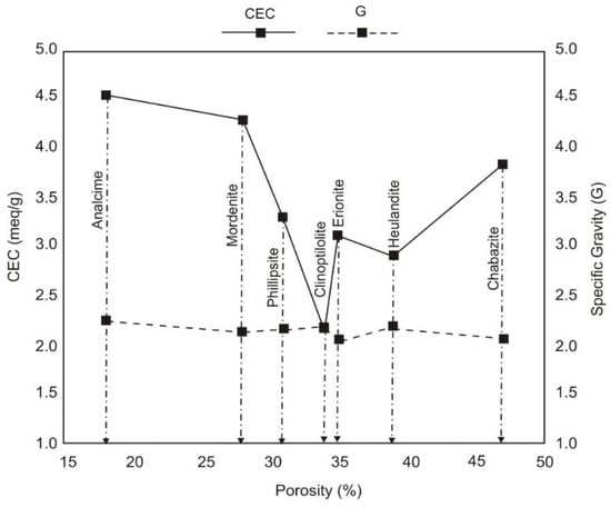 Cation exchange capacity (CEC) and specific gravity (G) variation with porosity of most common natural zeolites (adapted from [61]).