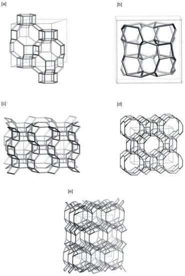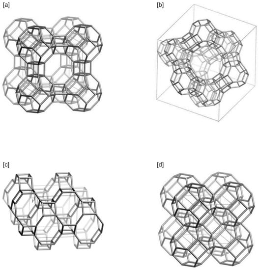 Literature data documented the formation of synthetic zeolites using several raw materials ranging from natural minerals [63,64,65,66,67,68,69,70] to waste materials [71,72,73,74,75,76,77,78] or pure silica and alumina sources [79,80]. Moreover, zeolites have been synthesised using different methods such as conventional and pre-fused hydrothermal processes [81,82,83], ultrasonic or microwaves methods [84,85,86,87,88,89,90] and multi-step technology [91,92]. The most commonly formed zeolites are zeolite A (LTA), faujasite, zeolite P and sodalite (Figure 6). In the last few decades, many researches have focused on the formation of nanozeolites showing advanced applications in many contexts such as medicine, catalysis, or the food industry [93,94,95].
