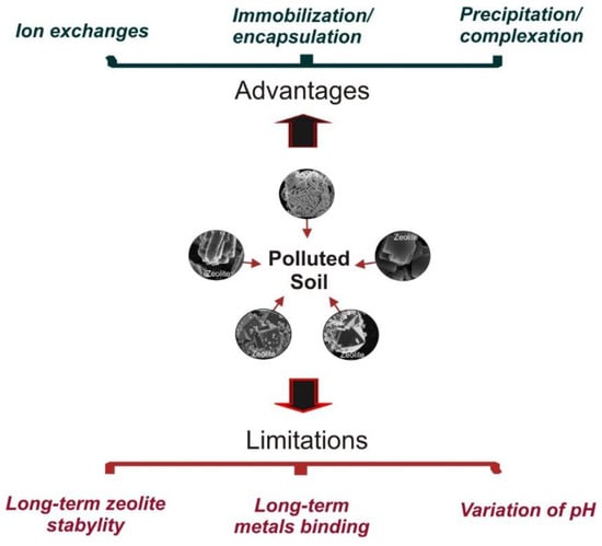 Many of the literature data have documented the large use of natural and synthetic zeolites for water remediation, whereas research on zeolite application to stabilize pollutants in the soil is still limited. Below, we discuss the application of different types of zeolites in toxic-metal soil remediation, exploring the advantages and limitations of the amendment process (Figure 7).