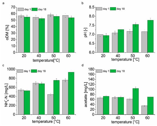 Figure 2a). The degradation of organic dry matter decreases with the drop in temperature. The highest oDM degradation of 6% was found at 60 °C, the lowest oDM degradation of 3.4% at 20 °C. Significant differences between pH of samples were determined only at 60, 50, and 40 °C after 18 days (