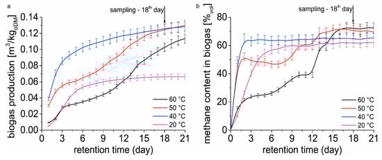 Figure 3b), it is clear that a different temperature in the fermenter has an impact on the course of methane content in biogas. At 20 and 40 °C the stationary methane content in biogas was observed after 6 and 3 days of biomethanation assay, respectively. Increased temperature caused a slowdown in methane content in biogas after 2 days of the biomethanation assay. A continual increase in methane content in biogas was observed again after 8 and 12 days in fermenters operated at 50 and 60 °C, respectively. After 21 days of retention time, a significant difference in methane content was found only in fermenters operated at 20 °C.