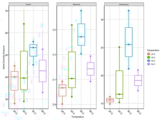 Table S3). One sample at 60 °C was excluded because of the very low numbers of sequences per samples. The mean length was 480 bp per sequence, and the sequences were subsampled (n = 5650) to ensure that a consistent and equal number of sequences from each sample be used for further analysis. The alpha diversity was calculated with normalized rarefaction values in collected samples from bioreactors to describe the archaeal community richness. In the case of species richness (estimated by Chao index) and diversity (determined by Shannon and InvSimpson indices), an increasing trend from 20 to 50 °C is evident with a marked decrease at 60 °C (