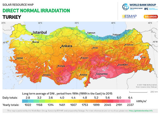 Turkey has a vast potential for solar energy as the location of the country lies in a region of high solar radiation, i.e., between 36° N and 42° N latitudes [47]. The country receives a total annual solar radiation duration of 2741 h (a total of 7.5 h/day), and the total solar energy derived per year is 1527 kWh/m2 per year (total 4.18 kWh/m2/day) [48]. The black sea region and southeast Anatolia have sufficient solar energy to generate electricity. Solar energy would be a guarantee to mitigate dependency on energy imports and enhance energy security for the sustainable development of Turkey. The direct normal irradiation map of Turkey is presented in Figure 1 [49].