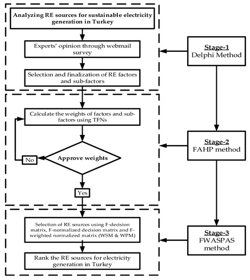 It is identified that the country is very rich in RE sources; therefore, it is essential to build sustainable energy plans and strategies for its development. However, analyzing these sustainable energy sources is a challenging and complex task with different opinions of stakeholders, governments, and policymakers. Therefore, this study develops an integrated decision methodology based on the Delphi, FAHP, and FWASPAS approaches for the selection of RE sources in Turkey.