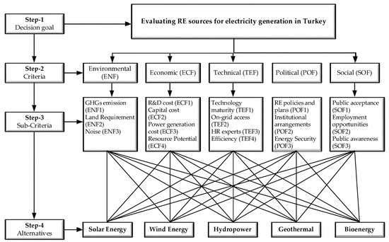 The installation of RE projects requires comprehensive planning and implementation of the projects considering environmental, economic, technical, political, and social aspects. The multi-criteria decision analysis (MCDA) serves this purpose well and enables the energy planners and policymakers to make assessment and analysis of these renewable projects [8]. The fuzzy-based MCDA models enable the minimization of uncertainty in human decision-making and provide robust results [9]. The selection of the most suitable RE source is an MCDA problem, due to its various conflicting criteria, such as socio-economic, environmental, and political factors involved, in assessing multiple RE sources for electricity generation. Therefore, a comprehensive decision-making process is required in order to achieve the objective and solve the decision-making problem.