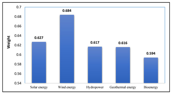 The ranking order of five RE sources based on , , and values is presented in Table 9. Further, the RE source with the highest value of is considered as the most feasible alternative; therefore, the final ranking of the RE sources is shown in Figure 4. The results of the FWASPAS indicate that wind energy, with a weight of 0.684, is the most feasible option for generating electricity in Turkey, while solar energy is considered the second most important RE source, with a weight of 0.627. Hydropower obtained the third rank, with a weight of 0.617. Geothermal and bioenergy were considered the least important RE sources. Indeed, all these RE energy sources are very significant for sustainable electricity generation in Turkey.