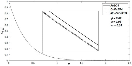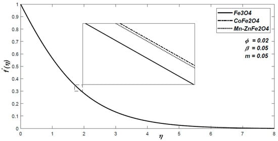 Figure 2 demonstrates the impact of the ferromagnetic solid particles on the nondimensional velocity distribution when the volume fraction is the ferromagnetic parameter is fixed as and the stretching parameter is . This plot shows that the velocity is the smallest and the boundary layer thickness is the shortest one for Fe3O4- water solution. For the same parameters, the thermal distribution is shown in Figure 3. It can be observed that the temperature gradient is also the largest for CoFe2O4. Based on the figures, the thickness of the momentum and the thermal boundary layer for the variable are around 8 and 2, respectively.