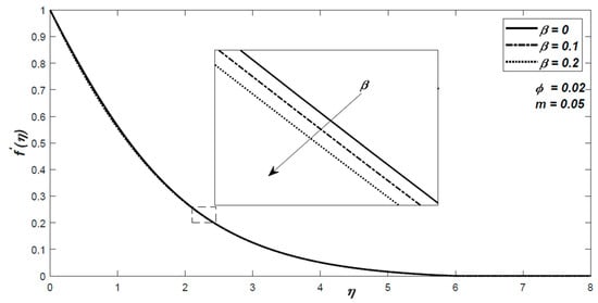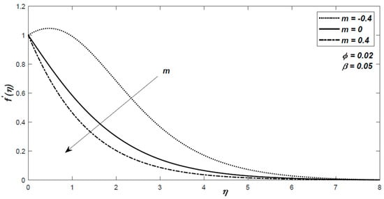 The coupled transformed system of differential Equations (13)–(14) subjected to boundary conditions (15) and (16) are solved numerically by employing the fourth-order method (bvp4c) in MATLAB. The influence of several physical parameters, namely the stretching exponent , the ferromagnetic interaction parameter , the Prandtl number Pr of the three types of nanofluids on the boundary layer flow and heat transfer in ferromagnetic viscoelastic fluid are investigated numerically. The system of Equations (13)–(14) are solved in the interval , the solutions at infinity converge to the boundary conditions. The physical parameters are taken from Table 1 for the nanoparticles Fe3O4, CoFe2O4, and Mn-ZnFe2O4 and for the water base fluid. The two differential equations are converted into a system of first order differential equations and solved.