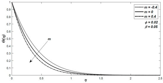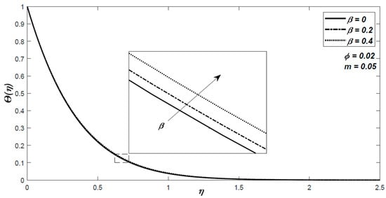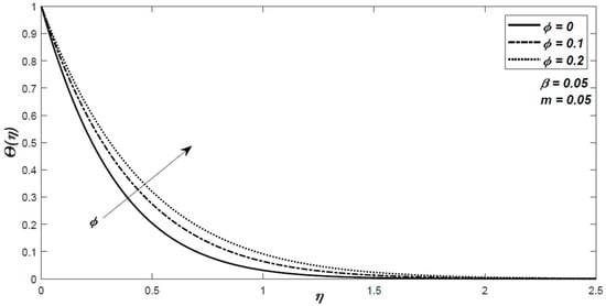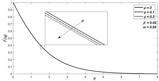 The effect of nanoparticle’s volume fraction on dimensionless velocity and temperature are shown in Figure 8 and Figure 9 for the ferrofluid water-Fe3O4. From these figures, it is noted that velocity decreases for increasing values of volume fraction . The influence of increasing nanoparticle concentration is the opposite in the temperature profiles.