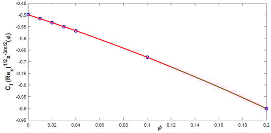 Quantities important for technical practice are the skin coefficient of friction and the local Nusselt number given by (17) and (18). For the ferrofluid with different nanoparticle concentration, the variation of the and are depicted on Figure 10 and Figure 11 for Fe3O4 with , . It is observed that the variation of the skin friction with the volume fraction of solid particles is decreasing in the interval . However, the local Nusselt number is increasing with values of the volume fraction .