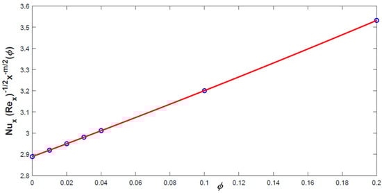We considered the impacts provided by the varying values of the pertinent parameters (stretching parameter, volume fraction, and ferromagnetic parameter) on the dimensional velocity, dimensional temperature, the skin friction, and local Nusselt number. Figure 2, Figure 3, Figure 4, Figure 5, Figure 6, Figure 7, Figure 8 and Figure 9 illustrate the variation in the velocity and temperature. We observed that the increase in the volume fraction slows down the flow and increases the temperature. The increase in the magnetic effect has the same impact on the velocity and temperature profiles. An increase in the stretching parameter will decrease both the velocity and the temperature. The Nusselt number and the skin friction for different values of the volume fraction are also analysed in Figure 10 and Figure 11. The Nusselt number is increasing and the skin friction is decreasing with an increasing value of