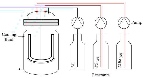 The laboratory SBR is a jacketed glass reactor with a maximum volume of 1 , equipped with mechanical stirring and reflux condenser. The reagents were fed using three Metrohm 876 Dosimat plus dosing units. PS and MBS are fed into the reactor as aqueous solutions, while the monomer is fed as a pure stream. A schematic representation of the experimental setup is reported in Figure 1.