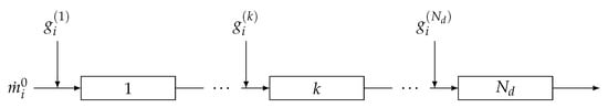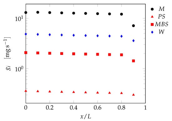 where is the outlet mass flowrate of species i from the previous reactor and the intermediate feedrate of species i pertaining to the considered PFR of the series (note that can be non-uniform along the series of PFRs). For the first reactor in the series is the mass flowrate of species i fed at the entrance of the series of PFRs. The values of the inlet and intermediate feedrates, along with their composition, are computed through a kinetics free procedure according to the number of reactors in the series, , starting from a given SBR recipe [,]. All reactors in the series are assumed to have the same geometrical parameters (length and cross-sectional area).