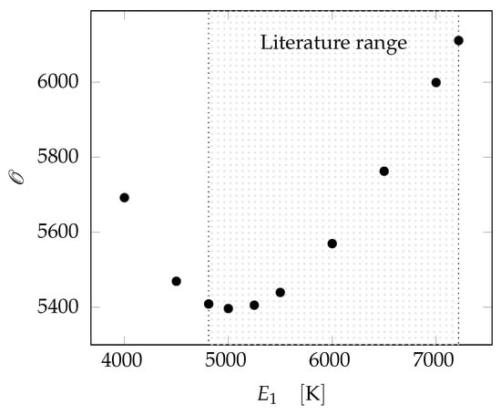 The fitting procedure was carried out by evaluating the objective function at different values according to the range proposed in []. The objective function, , behavior at changing values of the fitting parameter is reported in Figure 3. The optimum value of the parameter is found to be 5000 . This value will be used in the following for the validation procedure.