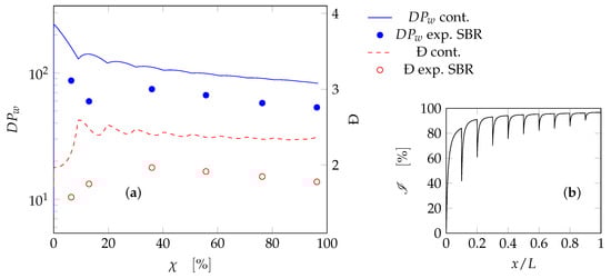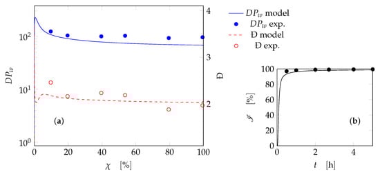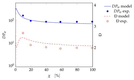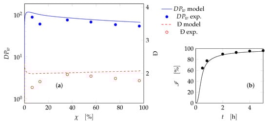 An example among those used for the fitting (test SBR4) is shown in Figure 4, where the weight-average chain length and polydispersity are plotted as a function of the overall monomer conversion for both the model predictions and the experimental results. A very good agreement is achieved for the polymer properties (in terms of degree of polymerization and polydispersity) during the reaction process. This means the model is consistent at any degree of monomer conversion. All other cases used in the fitting procedure can be found in the Supplementary Materials.